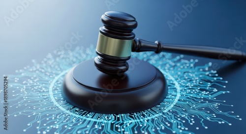 © Shahnaj, Obraz premium A gavel resting on a digital network, symbolizing legal decisions in the digital age.