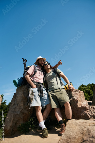 Obraz premium A gay couple hikes together through nature on a sunny summer day, enjoying the view from a rocky overlook.