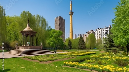 © Anugrah, Fototapeta premium A Gazebo in a City Park with a Tall Yellow Tower in the Background