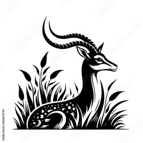 © MD, Naklejka premium A gazelle with long horns rests in grass isolated on white background
