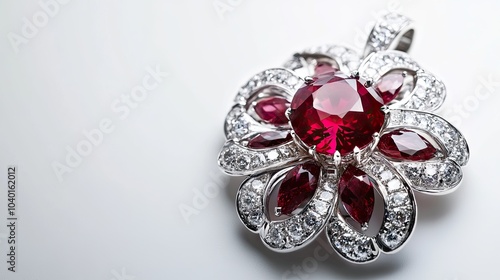 © Pannin, Fototapeta premium A gemstone pendant featuring a central ruby and diamond accents, placed against a white background