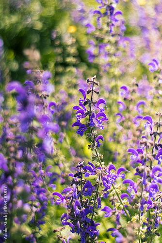 Fototapeta premium A gentle breeze flows through a meadow of purple salvia flowers, surrounded...