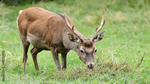 Fototapeta premium A gentle deer grazing peacefully in a lush green meadow during a sunny afternoon