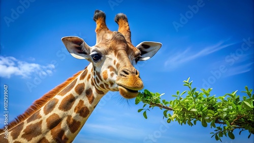 © Kukar Studio, Fototapeta premium A gentle giant gracefully reaches for a leafy branch against a backdrop of vibrant blue sky.