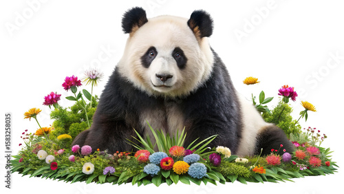 © Md, Fototapeta premium A gentle giant panda sits peacefully surrounded by a vibrant and colorful array of wildflowers and lush green foliage isolated on transparent background
