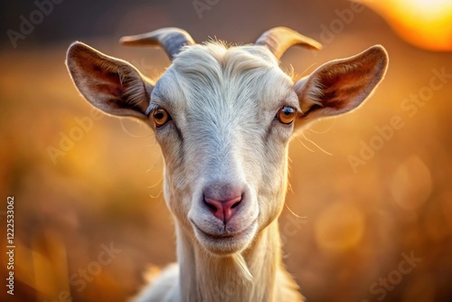 © Urenus Photos, Fototapeta premium A Gentle Goat Gazing Directly at the Camera in Warm Golden Hour Light