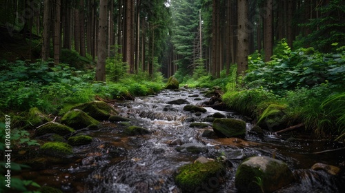 Obraz premium A gentle stream flowing through a dense forest, representing life's journey...