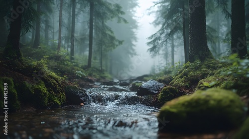Obraz premium A gentle stream flows through a misty forest, featuring moss-covered rocks...