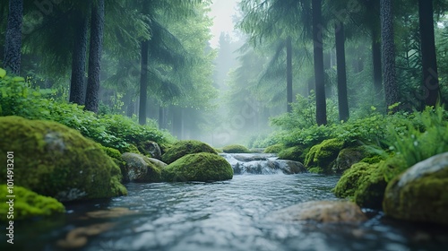 Obraz premium A gentle stream flows through a misty forest, featuring moss-covered rocks...