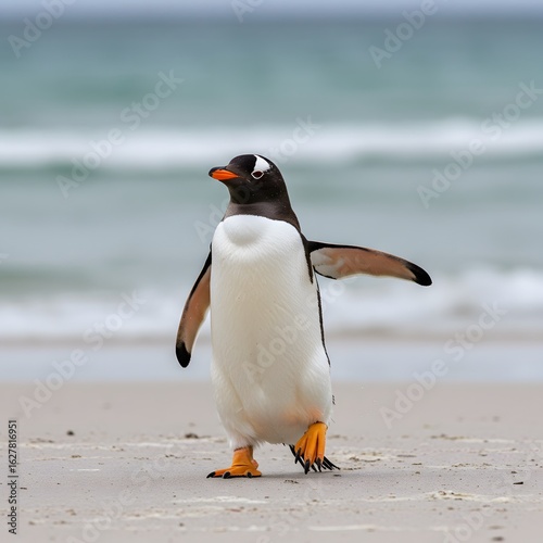 Naklejka premium a Gentoo penguin standing on a sandy beach, wings outstretched and one leg...