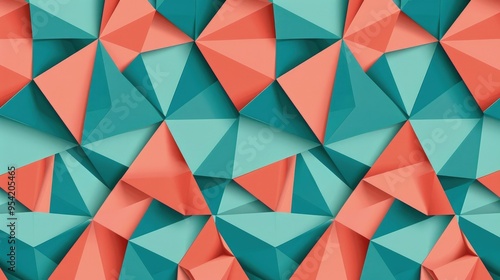 Obraz premium A geometric pattern of teal and coral triangles creating a dynamic visual...