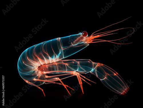 © Nathan Hutchcraft, Fototapeta premium A Geometric Shrimp Made of Glowing Lines of Light on a Solid Black Background