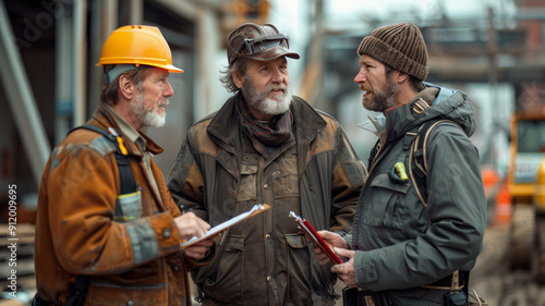 © JKLoma, Fototapeta premium a geotechnical engineer speaking with construction foremen at a new building site. The engineer is holding a clipboard.generative ai