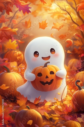 Naklejka premium A ghost, wielding a pumpkin in hand, stands amidst a field of leaves In the...
