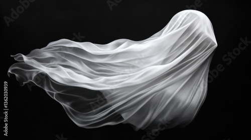 Fototapeta premium A ghostly figure with flowing white fabric against a black background....