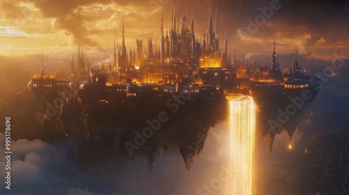 Fototapeta premium A giant floating castle with glowing turrets and a waterfall of light flowing...