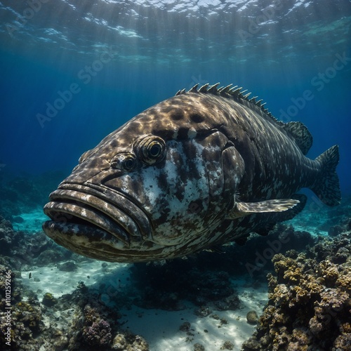 © Batool, Obraz premium A giant grouper resting near a shipwreck in deep, crystal-clear water.