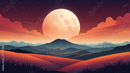 Fototapeta premium A giant, luminous moon dominates a serene nightscape over rolling hills and...