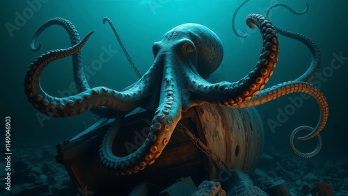 Fototapeta premium A giant octopus wrapped around a shipwreck with tentacles stretching out to the side, dark colors, ocean floor, shipwrecks, ocean monsters, octopuses