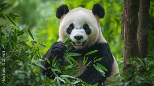 Fototapeta premium A giant panda sitting in a bamboo forest, happily munching on fresh green leaves