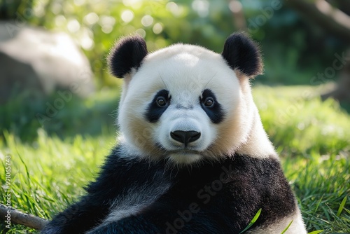 Obraz premium A giant panda with a curious expression on its face is seen sitting among lush green grass in a natural setting.
