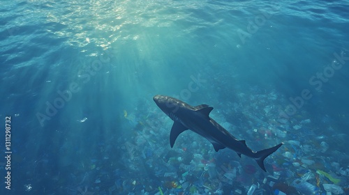 © simba kim, Fototapeta premium A giant shark swims through an ocean filled with plastic waste. Generative AI