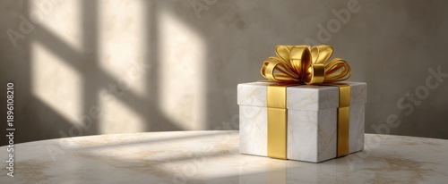 © ckybe, Fototapeta premium A gift box with a gold bow sparkles like sunshine on marble in a warm embrace.