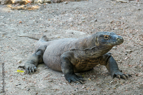 © Chris, Fototapeta premium A gigantic, venomous Komodo Dragon roaming free in Komodo National Park, Flores, Indonesia. The dragon is resting in a shadow with its stomach full. Dangerous animal in natural habitat.