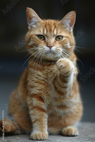 Obraz premium A ginger cat is sitting on a wooden railing with its paw raised in the air.