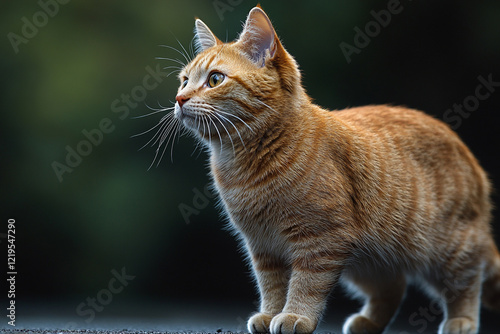 © Myartsam Design, Naklejka premium A ginger cat stands alertly outdoors at night