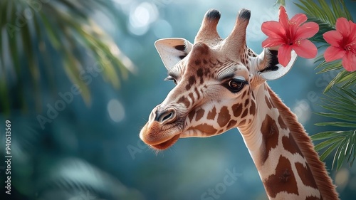 Obraz premium A giraffe exploring a lush, luxurious garden, surrounded by vibrant flowers...