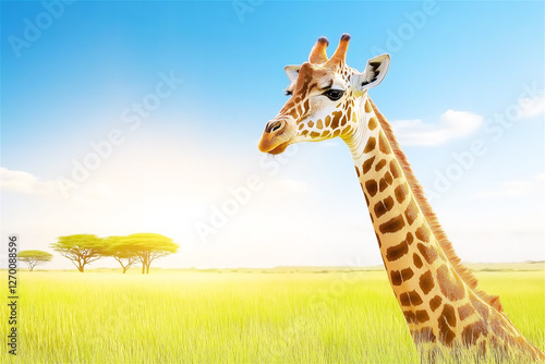 © Vasili, Fototapeta premium A giraffe grazing in the vast savannah, with its long neck reaching high into the air, against a clear blue sky, embodying the beauty of the African wilderness.
