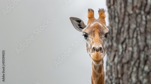 Naklejka premium A giraffe is peeking out from behind a tree trunk