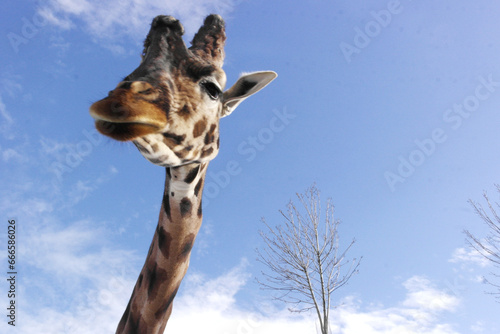 Fototapeta premium A giraffe's long, thin neck looks like a snake from below, its large, pointed...