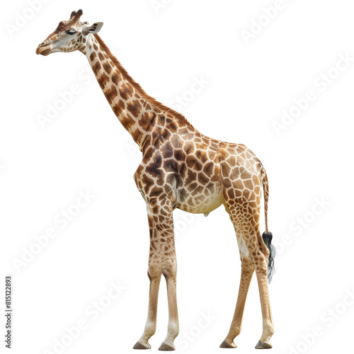 Naklejka premium A giraffe standing upright on a plain Png background, a giraffe isolated on transparent background