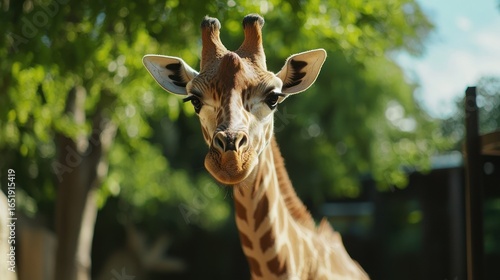 © Wattana, Naklejka premium A giraffe with a blurred background, looking directly at the camera.