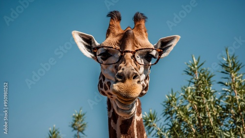 © JohnDesignHub, Fototapeta premium A giraffe with glasses against a blue sky and green foliage background