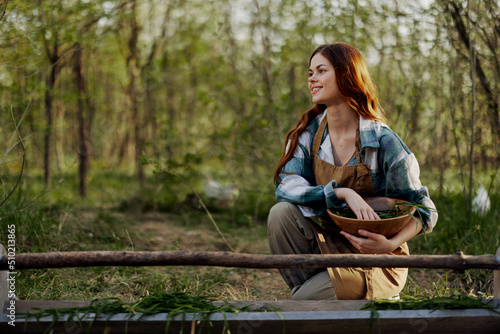 Naklejka premium A girl bird farm worker smiles and is happy pouring food into the chicken feeder in the fresh air sitting on the green grass