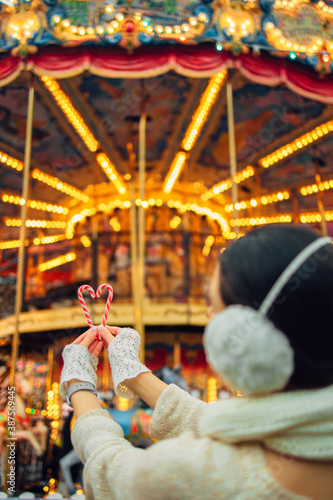 © NEZNAEV, Obraz premium A girl holds a red striped Christmas two candy cane in the background of the lights of the Christmas market. New Year and Christmas symbols.