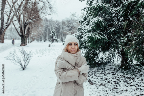 Obraz premium A girl in a beige coat is freezing against the backdrop of a winter forest