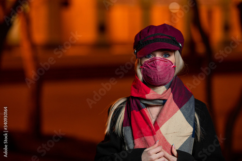 © Наталья Бирюкова, Obraz premium a girl in a black coat and in a red mask walks around the city at night