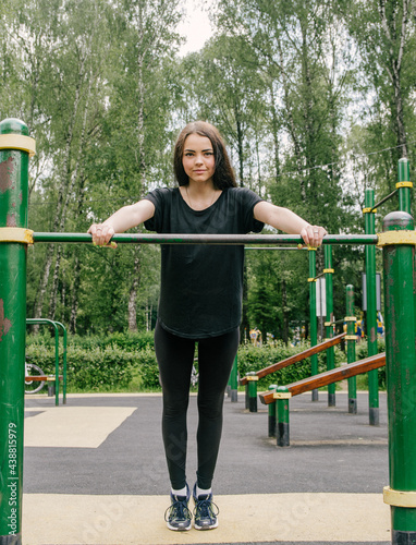 © Наталья Анюхина, Fototapeta premium a girl in a black T-shirt and leggings shakes her hands from the horizontal bar on the playground