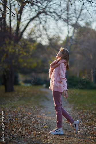 © Fotoproff, Fototapeta premium A girl in a knitted sweater in an autumn park. September or October, yellow leaves on trees.