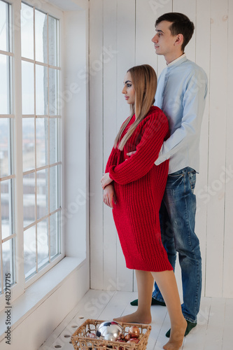 Fototapeta premium A girl in a red dress hugs a man in trousers and a shirt. Girl holding a basket with Christmas tree decorations
