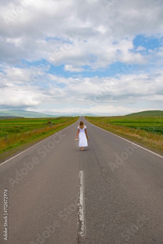 © Vyacheslav, Fototapeta premium A girl in a white dress is walking along the road