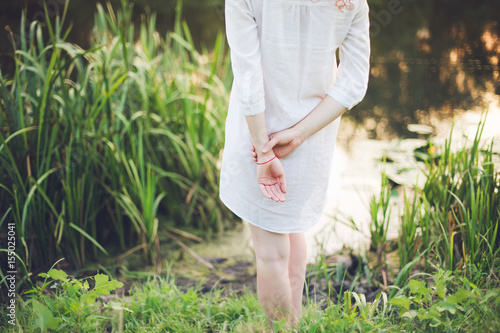 © Elizabeth, Fototapeta premium A girl in a white shirt is standing with her back