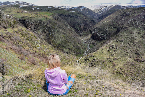 © Виктория Балобанова, Naklejka premium A girl on mount Aragats near the 7th-century Amberd fortress, at the confluence of the Arkashen and Amberd rivers, Armenia.