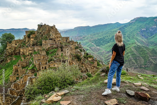 Naklejka premium A girl on the background of Gamsutl village in the Caucasus mountains, on top of a cliff. Dagestan Russia June 2021