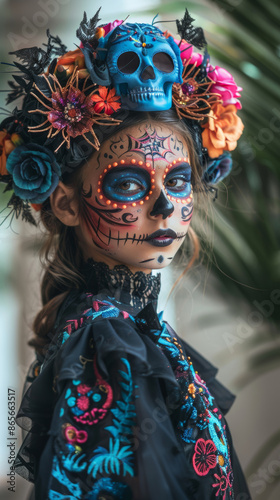 © Diffin, Fototapeta premium A girl with colorful Day of the Dead makeup and a floral headpiece, dressed in a detailed outfit, posing indoors
