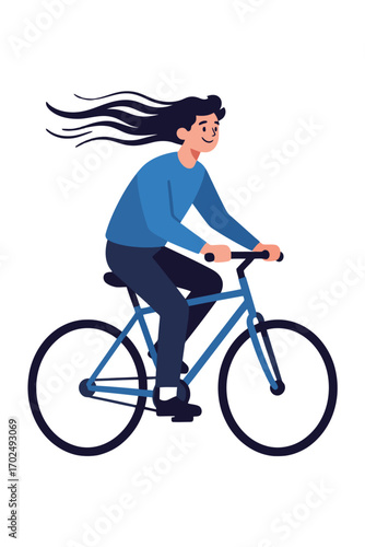 Fototapeta premium A girl with long, flowing black hair is riding a bicycle with a happy expression. The illustration shows a healthy, active lifestyle.